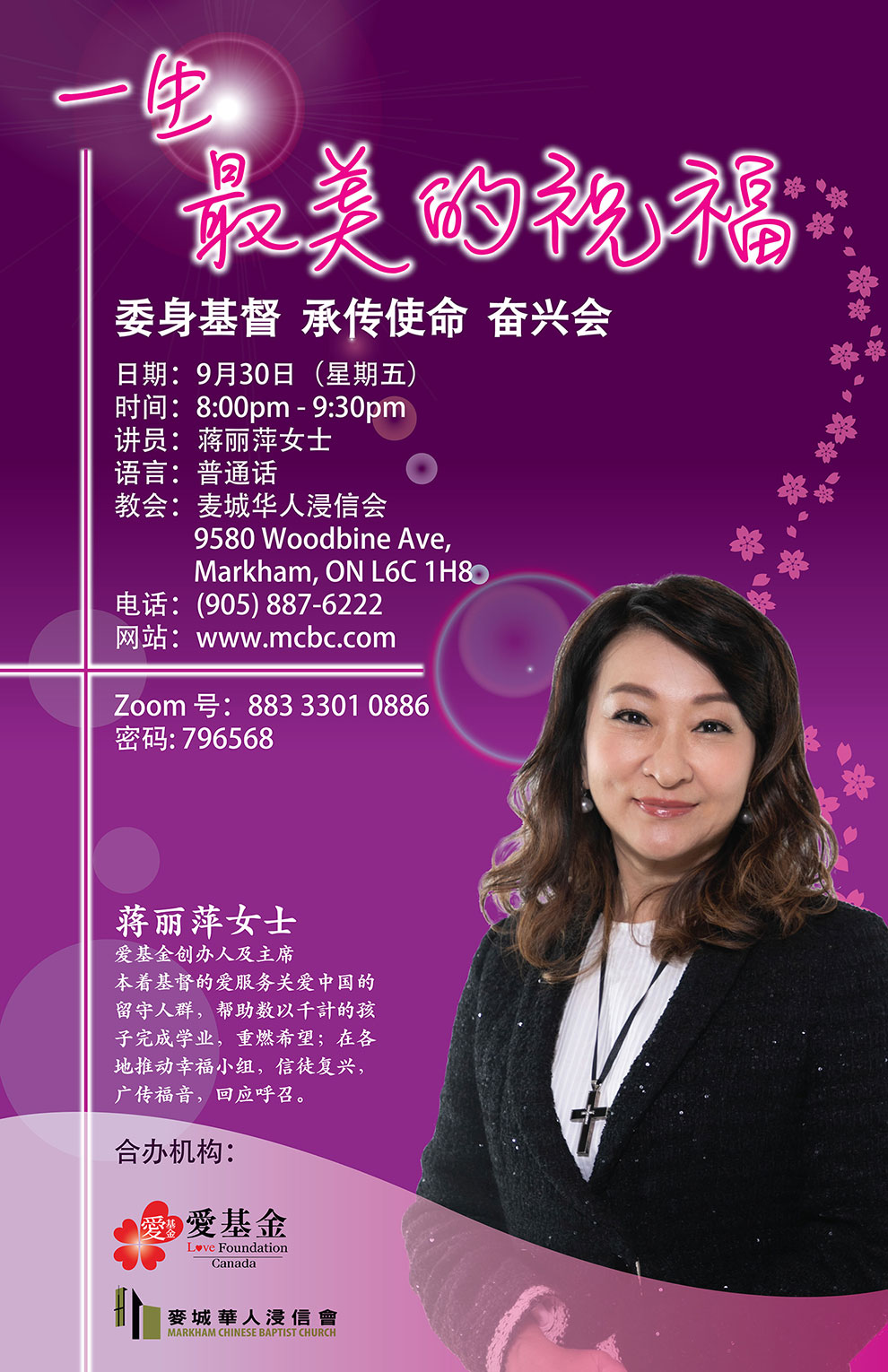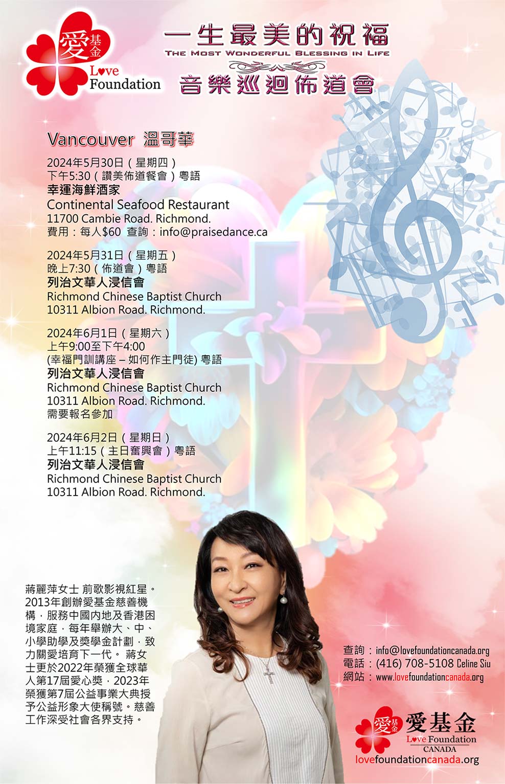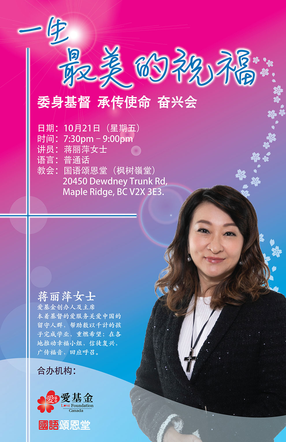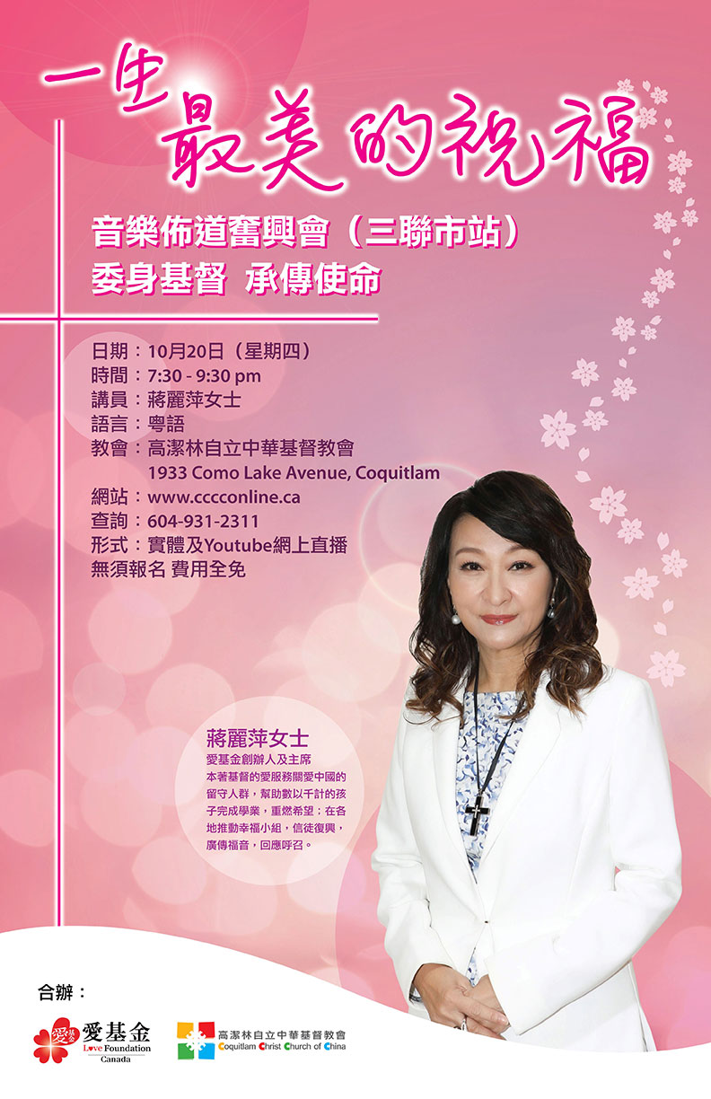 時間:下午 2:00PM (主日奮興會), 下午 3:45PM (愛基金中國事工分享會)